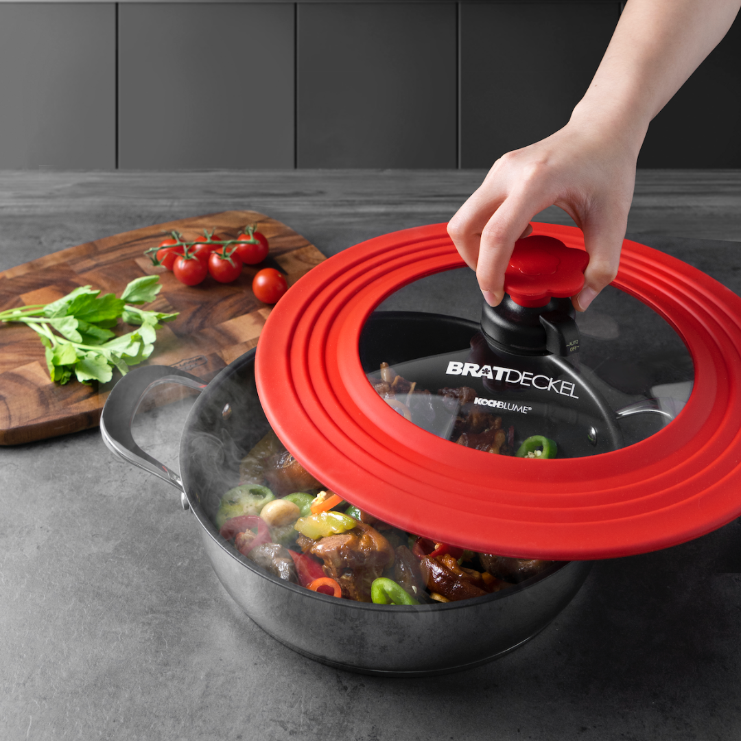 Avec le couvercle anti-projections universel 31 cm de Kochblume, vous pouvez rôtir et étuver de manière optimale. Ce couvercle permet de cuire et de frire dans des poêles d’un diamètre entre 22 et 28 cm. Il permet d’éviter les projections indésirables d’huile et de graisse dans la cuisine. Il s’utilise également dans le fourAvec ce couvercle multi-talents, vous pouvez, cuire, mijoter, frire, cuire à la vapeur. La valve automatique permet à l’eau de condensation de s’échapper pendant la cuisson et vous garantit ainsi des plats savoureux, doux et croustillants.