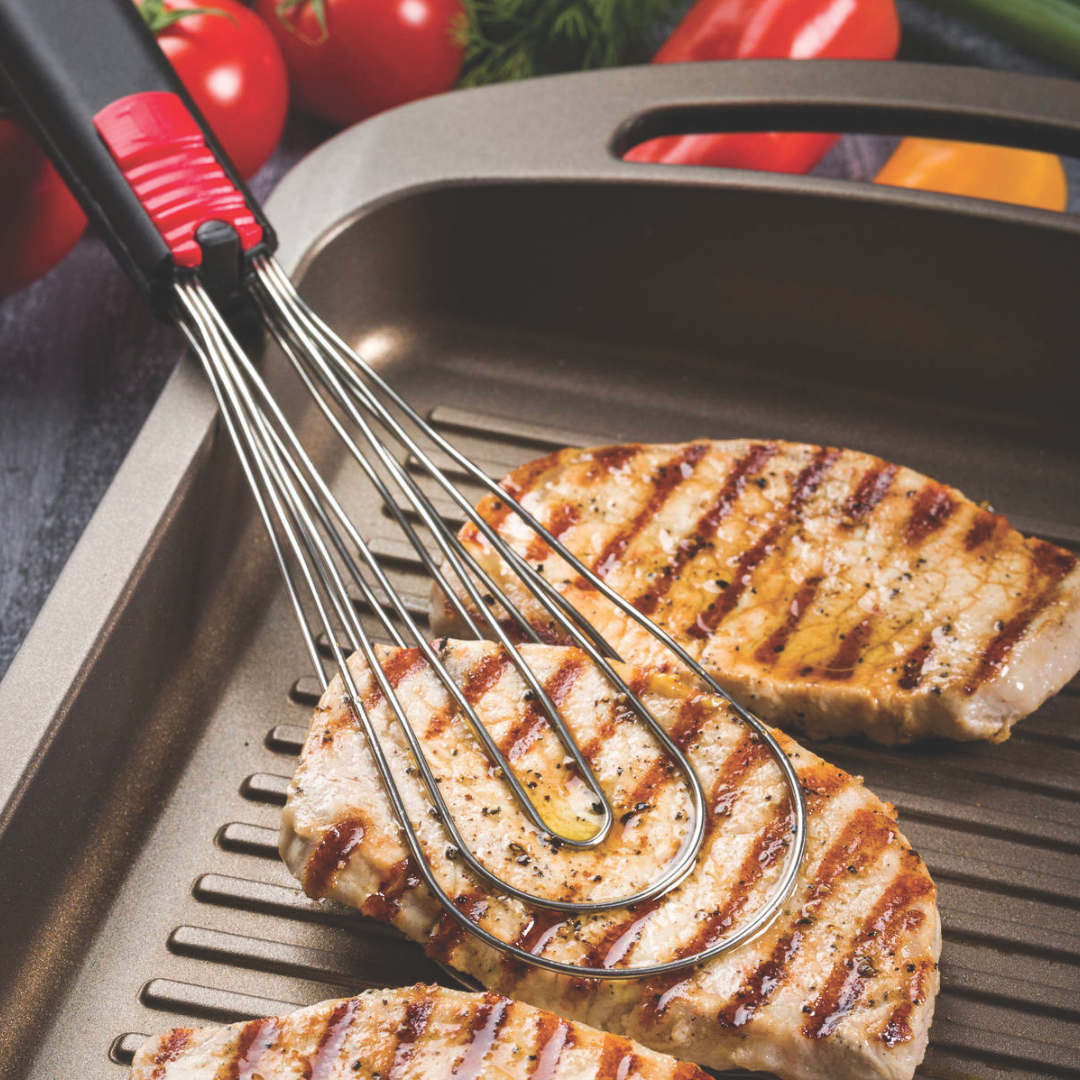 La pince et fouet Foodie L est idéale pour les amateurs de barbecue. Avec ses huit cordes en acier inoxydable, elle assure une prise parfaite sur les aliments de toutes tailles sans les percer. Vous pouvez l’utiliser comme des pinces pour attraper et retourner la viande ou le poisson sur le gril, ou comme un gril de maintien sécurisé.