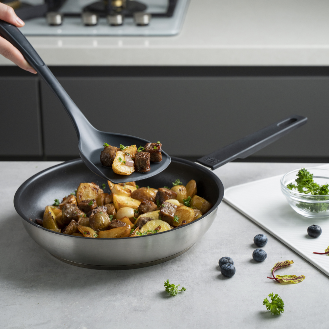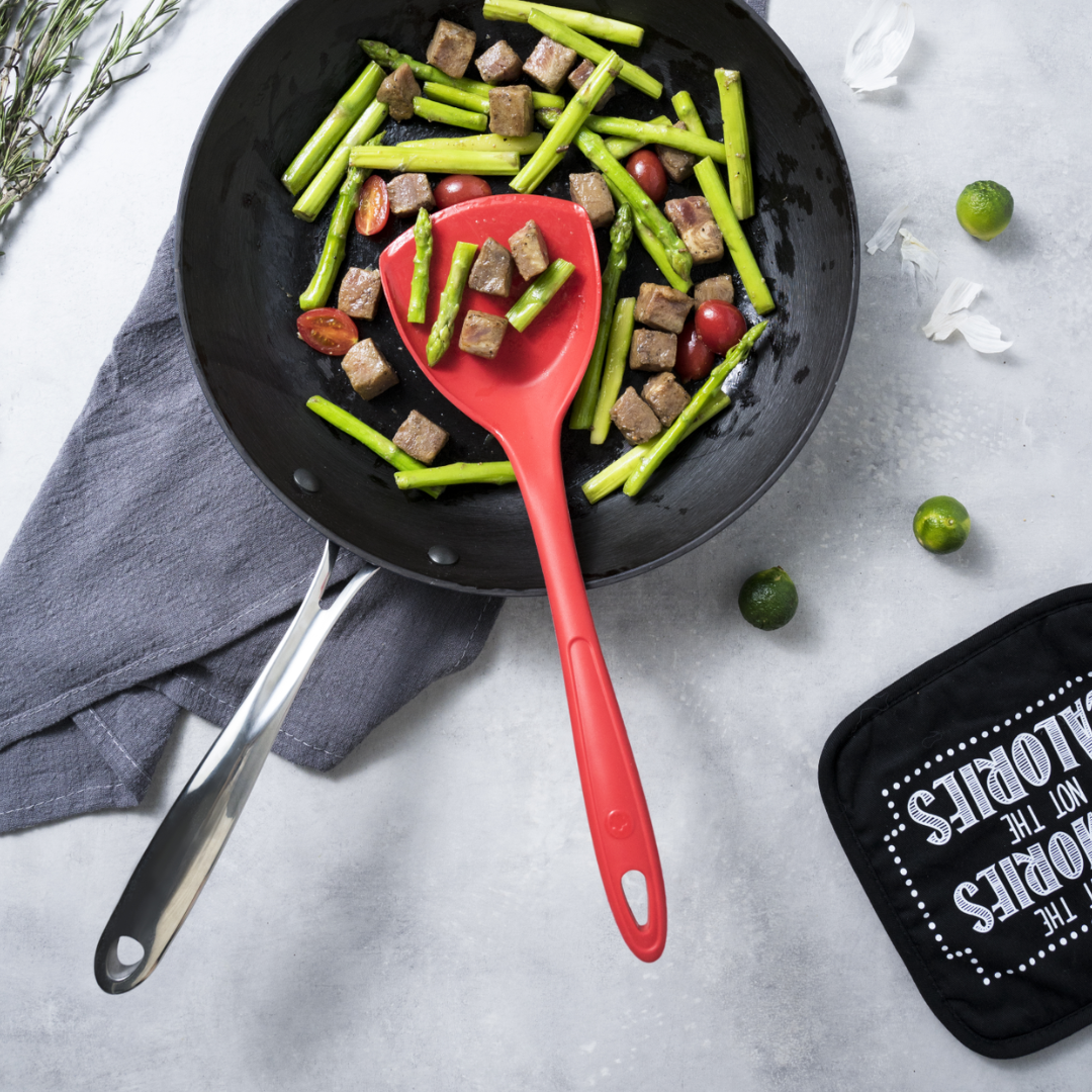 La surface généreuse de la spatule à poêle de 36 cm est idéale pour retourner et servir des plats tels que les pommes de terre sautées ou les crêpes. Cette spatule se distingue par sa souplesse, son design bien pensé et les différentes options de couleur. De plus, elle est conçue pour être antibactérienne et préserve l’intégrité de vos ustensiles de cuisine.