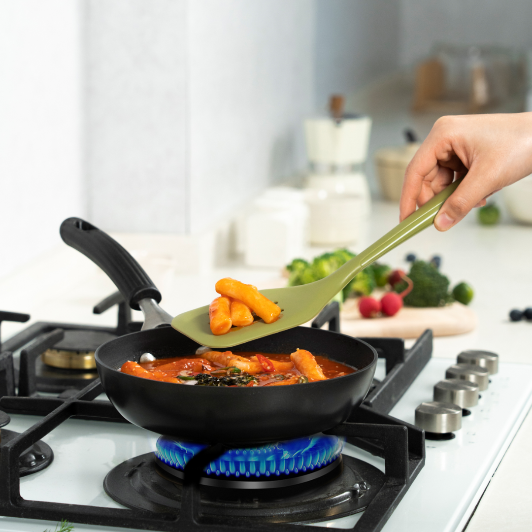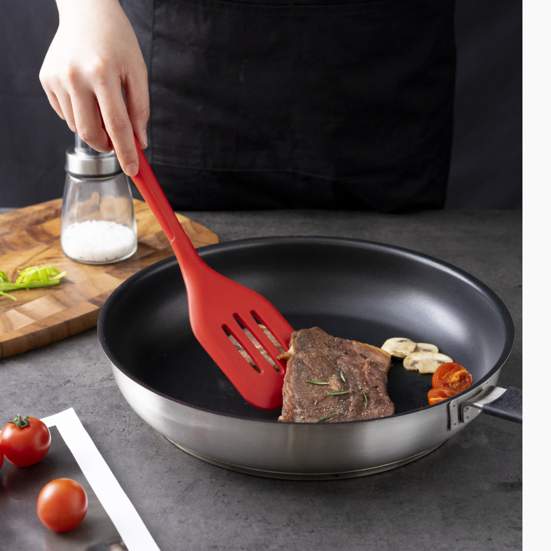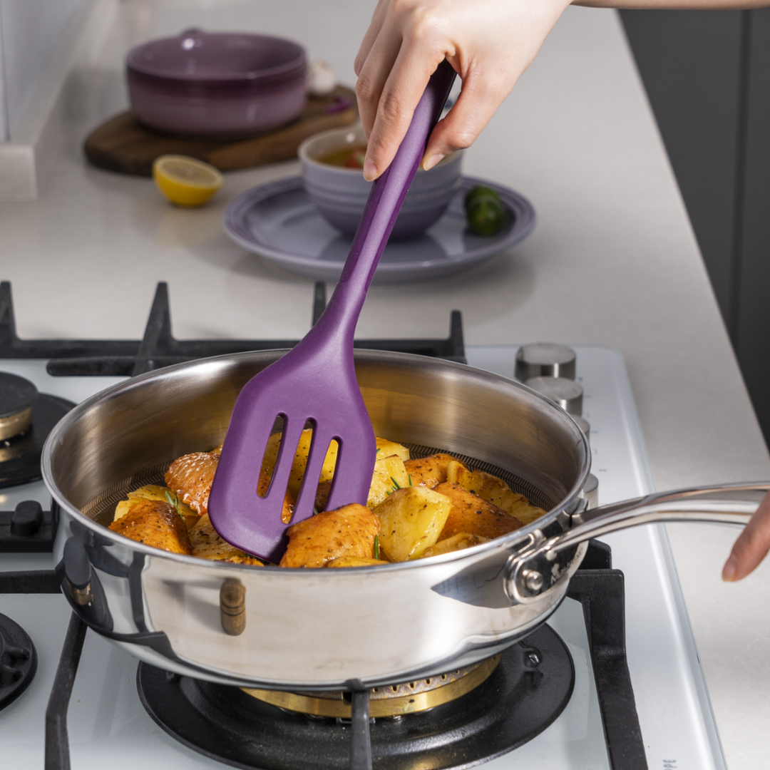 La spatule à poêle souple en silicone 30 cm Kochblume est l’aide indispensable pour vos plats cuisinés. Sa structure souple en silicone la rend multi-usage et très facile à utiliser, elle peut servir comme spatule pour les fritures ou comme spatule pour les aliments grillés. Parfaite pour tout ce qui atterrit dans la poêle ! Les quatre fentes empêchent que du bouillon, de la sauce ou de l’huile de friture soient enlevées involontairement de la poêle. Antibactérienne, elle ne raye pas les récipients.