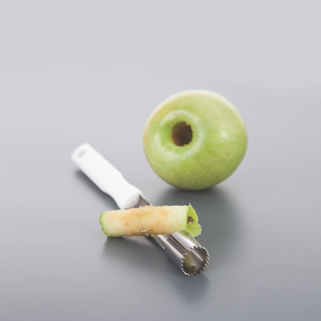 Avec le vide pomme 20 mm de CookJeny, évidez facilement le coeur des fruits comme les pommes ou poires, mais aussi certains légumes, comme les petites courgettes. Visser autour du pédoncule, extraire puis éjecter.